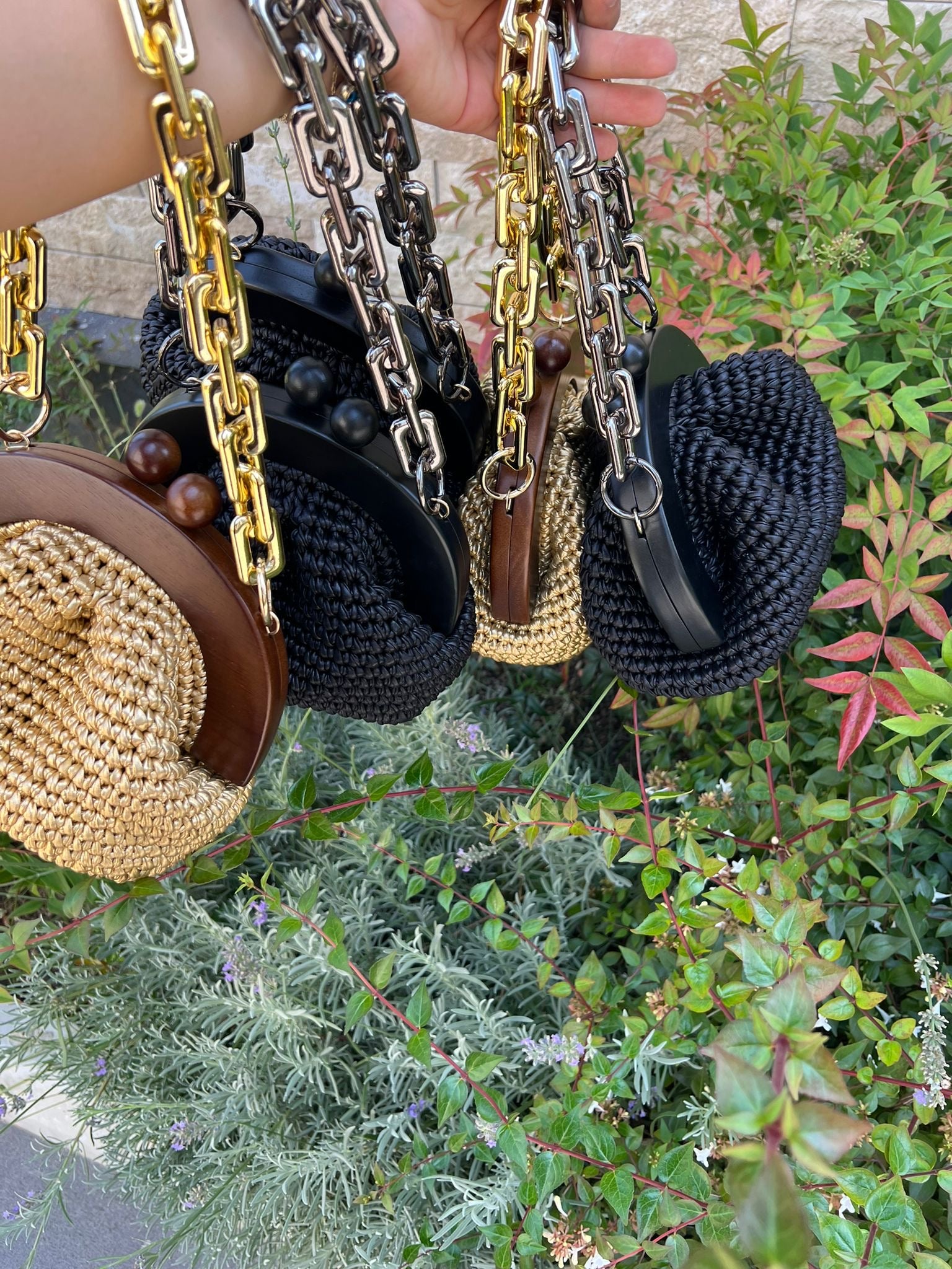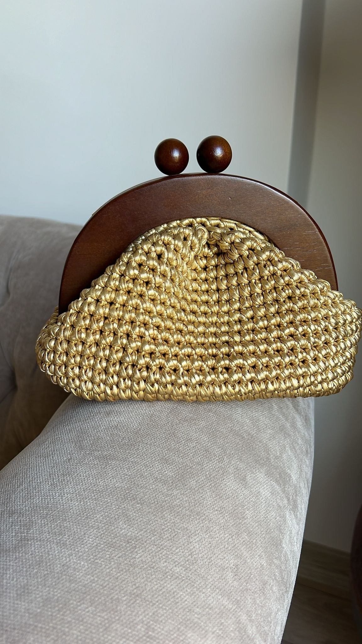 The metallic bag – made of two types of leather, with a wooden handle and a plated chain
